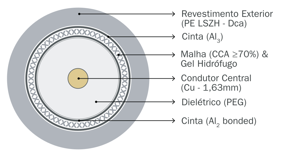 Cabo fabricado sob os mais altos padrões de qualidade, oferecendo excelentes prestações elétricas, resistência mecânica, durabilidade e estabilidade dos valores de atenuação.