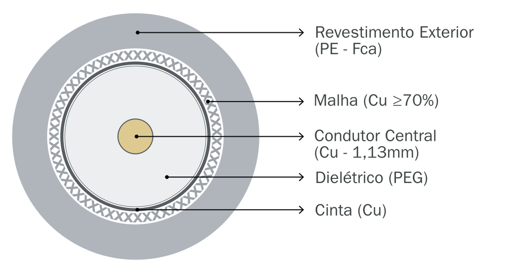 Cabo Coaxial RG6 com condutor central, cinta e malha em cobre, com performance que excede os requisitos da categoria TCD-C (5MHz~3GHz), destinado a redes de distribuição de Televisão por Cabo (CATV), TDT e Satélite (SMATV).