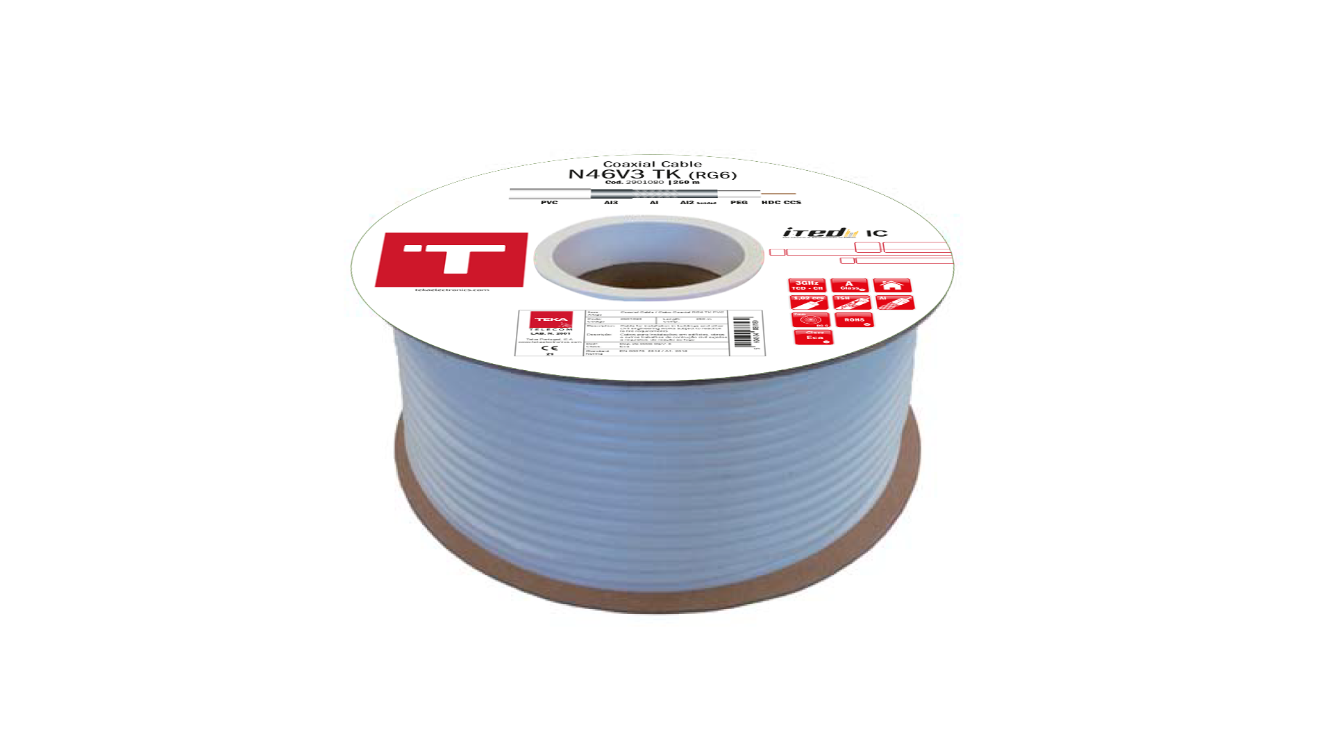 Cabo Coaxial RG6 com condutor central, cinta e malha em cobre, com performance que excede os requisitos da categoria TCD-C (5MHz~3GHz), destinado a redes de distribuição de Televisão por Cabo (CATV), TDT e Satélite (SMATV).