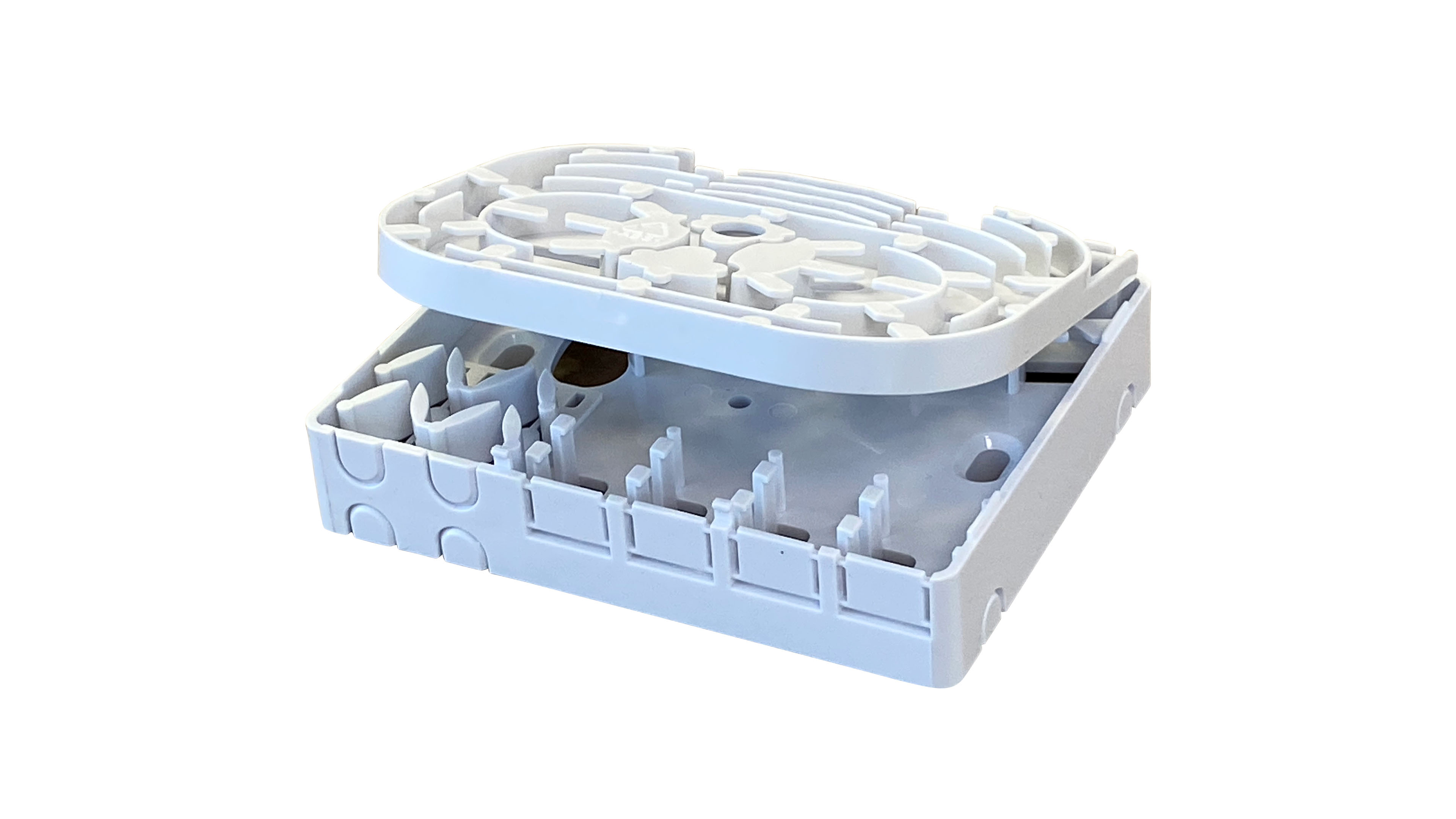 A caixa terminal ótica de dupla camada possibilita uma coabitação estável e protegida entre o cabo de fibra ótica e os pigtails e proteções de fusão.