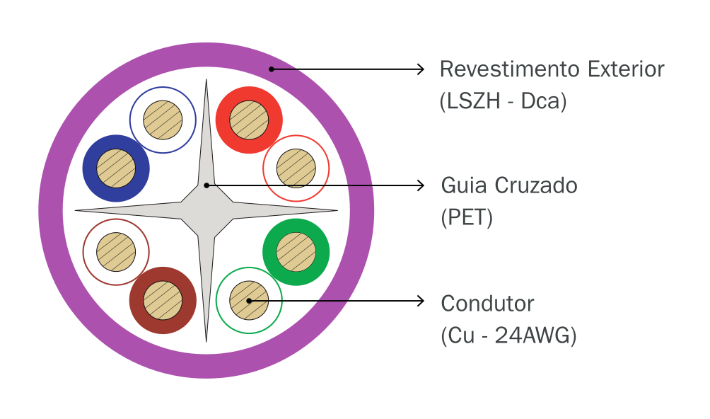 Cabo U/UTP (Unshielded Twisted Pair) com performances certificadas até 250MHz que excede os requisitos da Cat 6/Classe E.